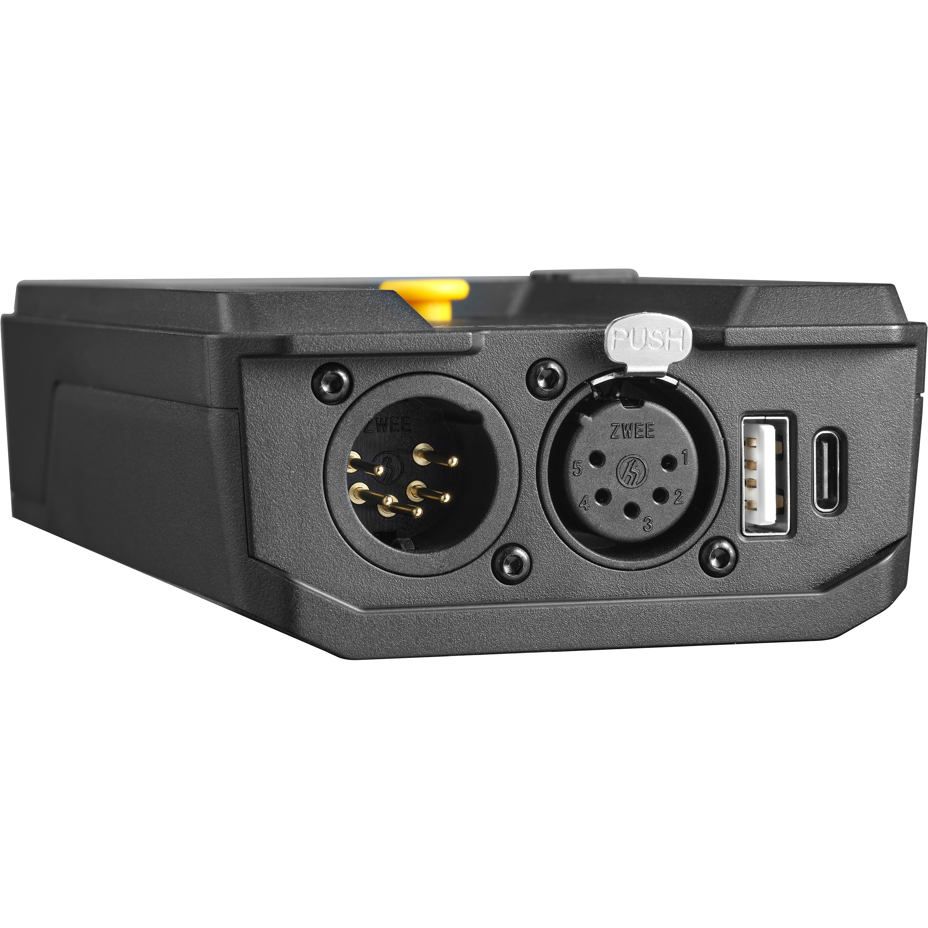 Рассеиватель питается от адаптера USB-C или аккумуляторов V-mount/NPF (адаптер и аккумуляторы приобретаются отдельно). От одного аккумулятора ёмкостью 100 Вт·ч панель работает до 20 часов при максимальной нагрузке — этого хватит даже на самые продолжительные съёмки.