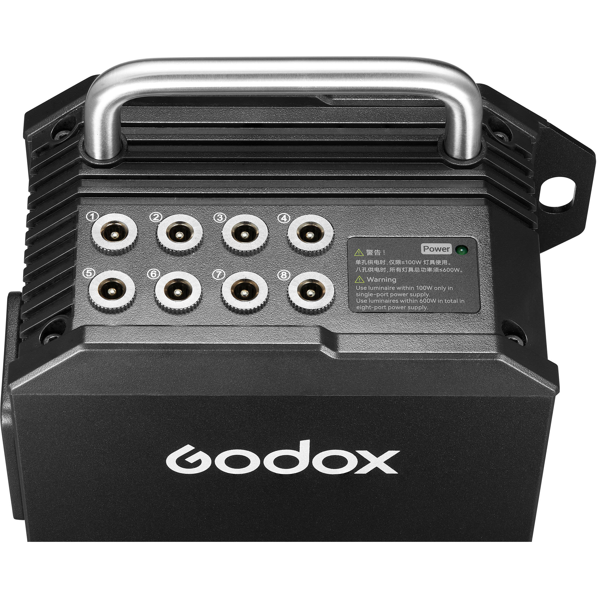 Блок питания Godox Knowled TP-P600KIT имеет восемь выходных разъемов для одновременного питания осветительных приборов серий TL и TP. К каждому выходу питания можно подключить осветительный прибор мощностью до 105 Вт, но суммарная максимальная выходная мощность блока питания, при подключении к нему нескольких приборов, составляет до 600 Вт