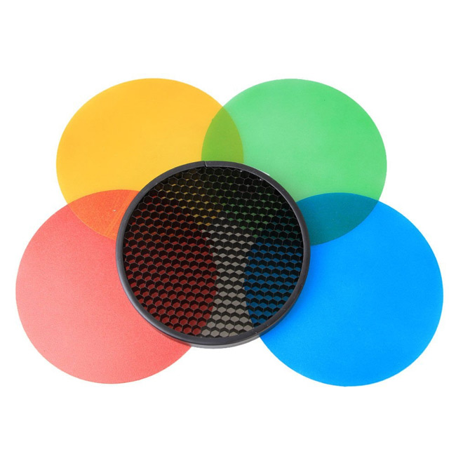 Цветные фильтры гели и сотовая решетка Godox AD-S11 устанавливаются на стандартный рефлектор AD-S2 (приобретается отдельно) для вспышек Godox WITSTRO. В наборе четыре цвета: красный, желтый, голубой, зеленый и сотовая решетка.