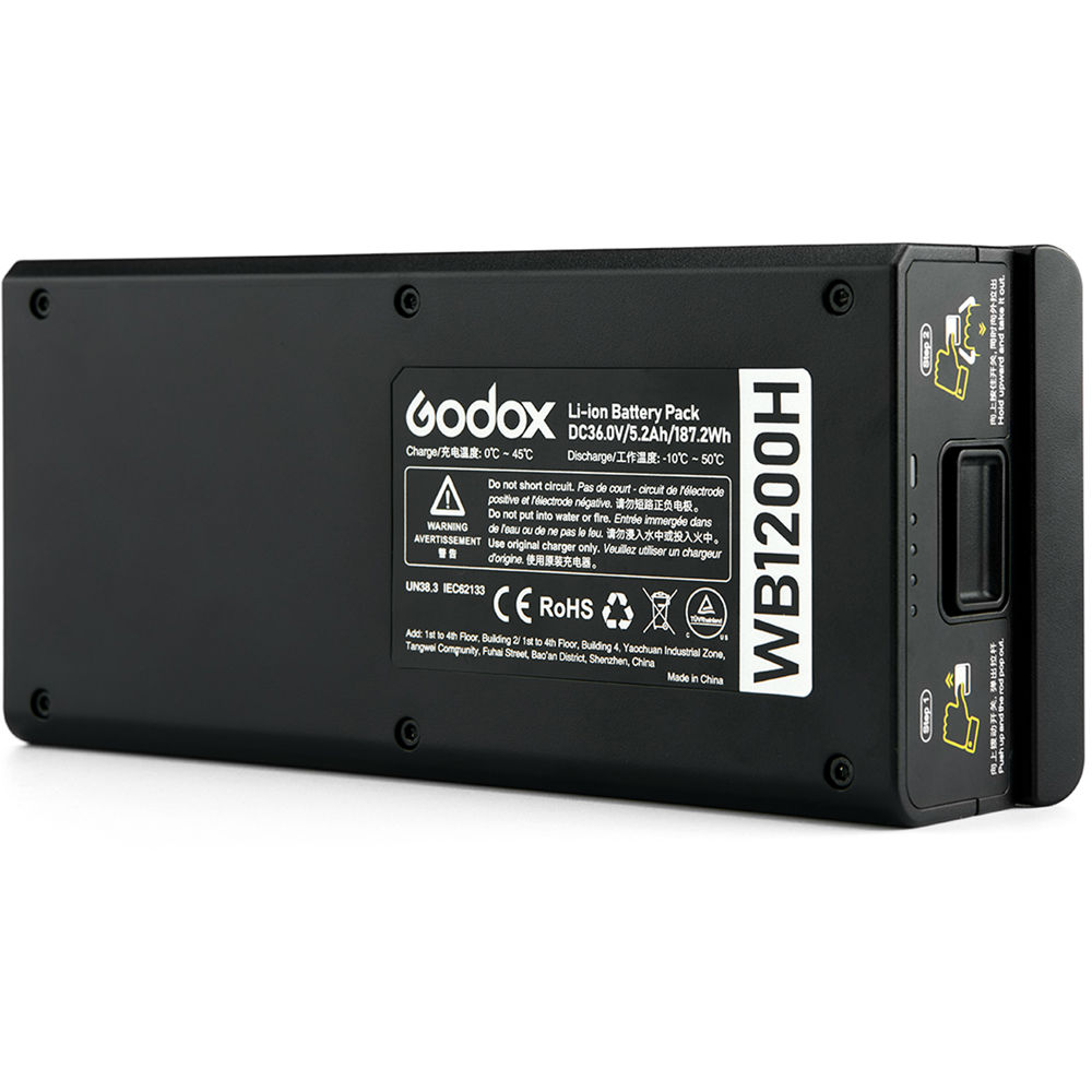 Аккумулятор Godox WB1200H предназначен для использования с генераторной вспышкой AD1200Pro, емкость аккумулятора составляет 5200 мАч, напряжение 36 В.