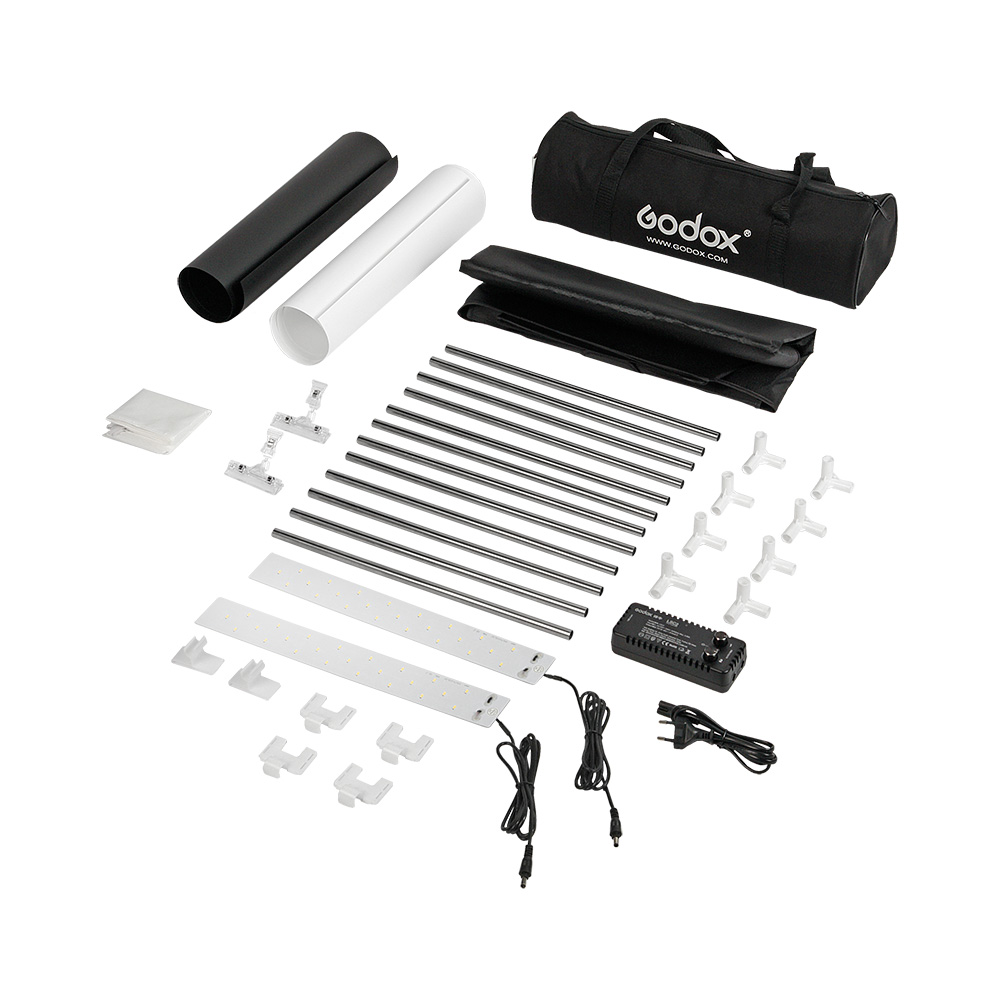 Освещение фотобокса осуществляется двумя мощными светодиодными линейками. С помощью кабеля со штекером, каждая линейка подключается к адаптеру питания Godox LSC2.