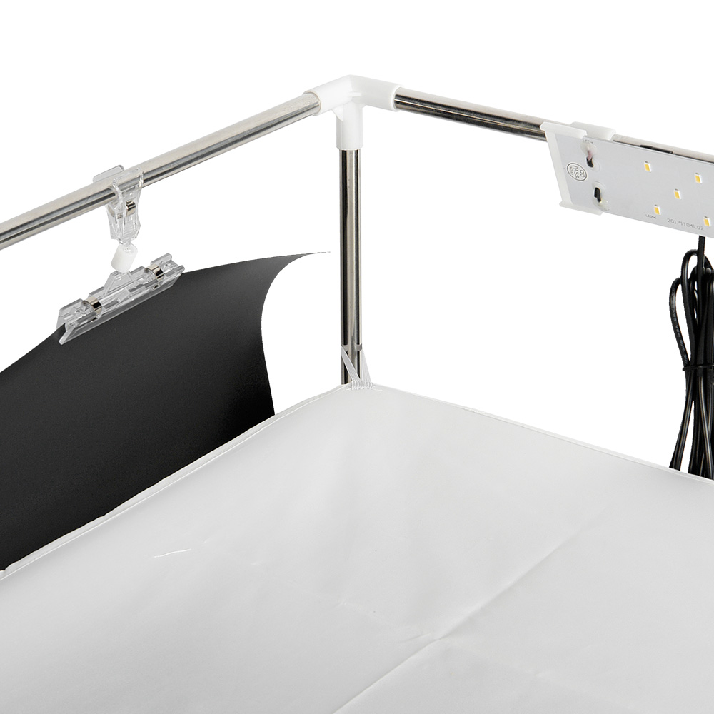 В комплекте предусмотрено два пластиковых полуматовых фона. Цвета фонов: чёрный и белый. Крепление фона к каркасу производится двумя комплектными прищепками.