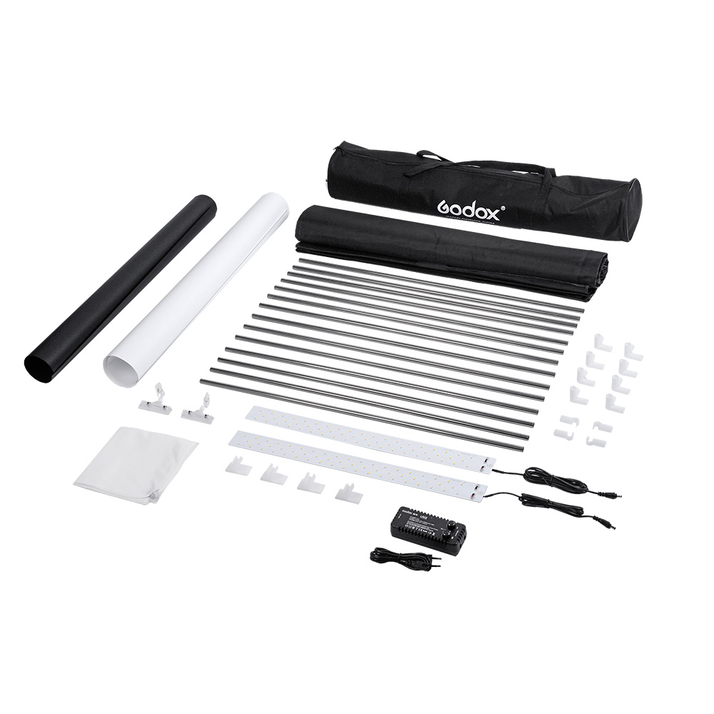 Освещение фотобокса осуществляется двумя мощными светодиодными линейками. С помощью кабеля со штекером, каждая линейка подключается к адаптеру питания Godox LSC2.