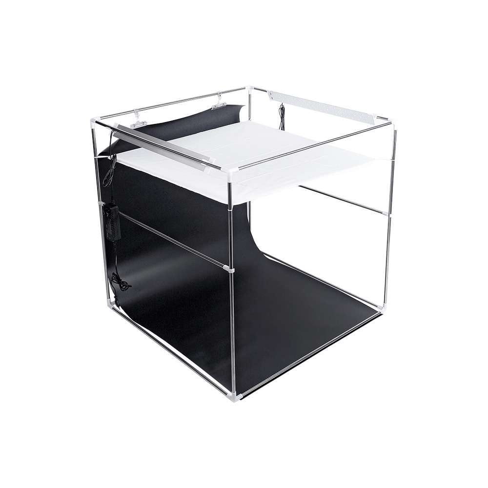 Конструкция представляет собой трубчатый каркас с надетым на него тентом с внутренними серебристыми отражающими поверхностями. Для придания дополнительной жёсткости каркасу, в комплекте предусмотрены две дополнительные трубки с клипсами. На гранях тента фотобокса есть три отверстия закрытые клапанами на липучке. Два больших отверстия расположены на передней и верхней гранях фотобокса и предназначены для фотографирования объектов с разных ракурсов. Маленькое отверстие (на верхней грани) предназначено для заведения кабелей питания светодиодных линеек внутрь фотобокса. Фотографирование предметов также можно осуществлять полностью откинув переднюю грань фотобокса.