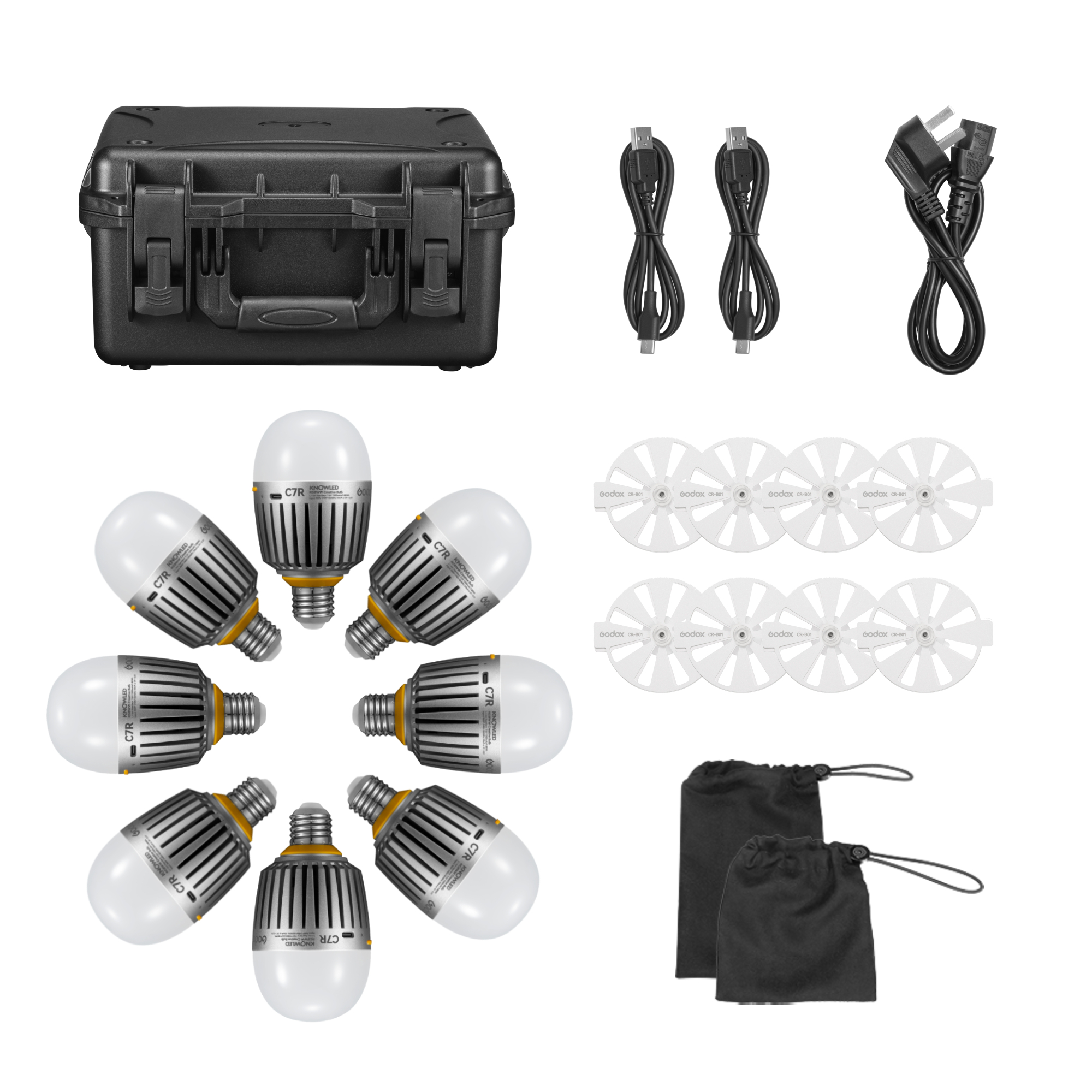 Зарядный кейс, входящий в комплект C7R-K8, обеспечивает портативную беспроводную зарядку для восьми светодиодных ламп C7R, делая работу с освещением на съемочной площадке более простой и эффективной. Зарядный кейс изготовлен из ударопрочного пластика и вмещает в себя не только 8 осветительных приборов, но и весь комплект аксессуаров к ним.
