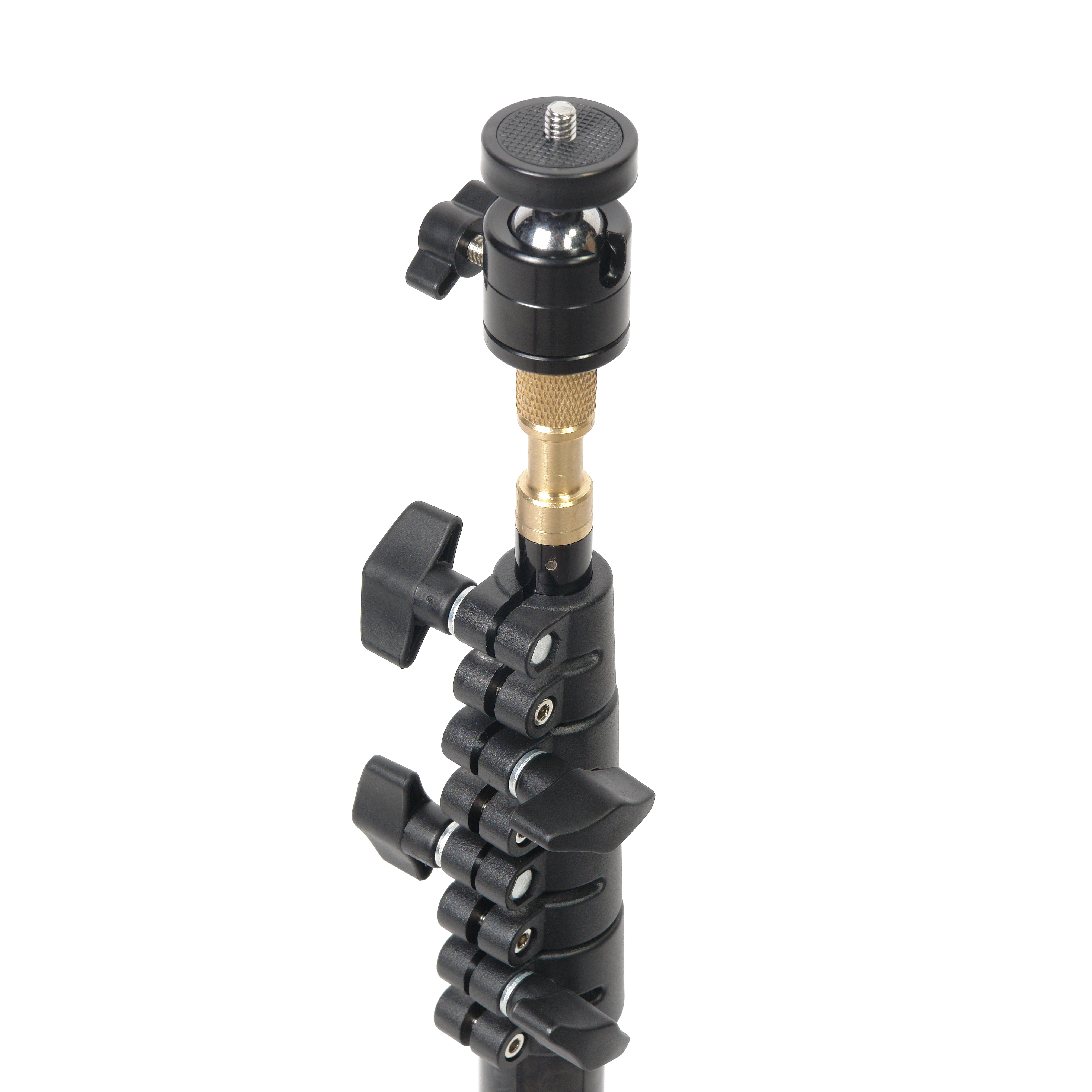 Стойка Godox 210F снабжена шаровой головкой с металлическими винтом на конце (с посадочной резьбой 1/4”), на который устанавливаются, например, цифровые камеры. Установленное оборудование может вращаться вокруг своей оси на 360 и наклоняться вперед в пределах 90°. В комплект также входит гайка-переходник с резьбы 1/4” на 3/8”.