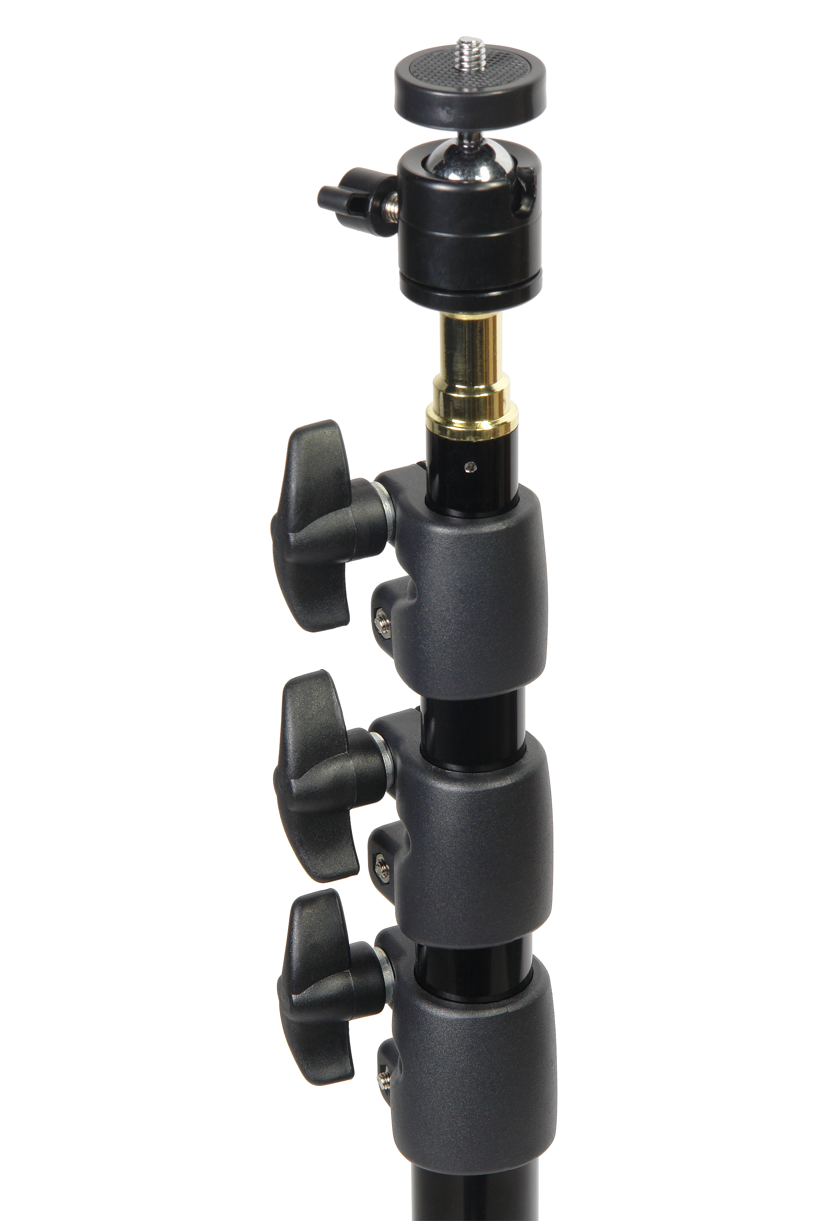 Несъемный латунный шпигот 5/8” (с винтом 1/4”) прикреплен на конце 4-секционной телескопической трубы стойки. К шпиготу может крепиться комплектная шаровая головка также с винтом 1/4” на конце. Оборудование, установленное на шаровую головку, может вращаться вокруг своей оси на 360° и наклоняться вперед в пределах 90°.