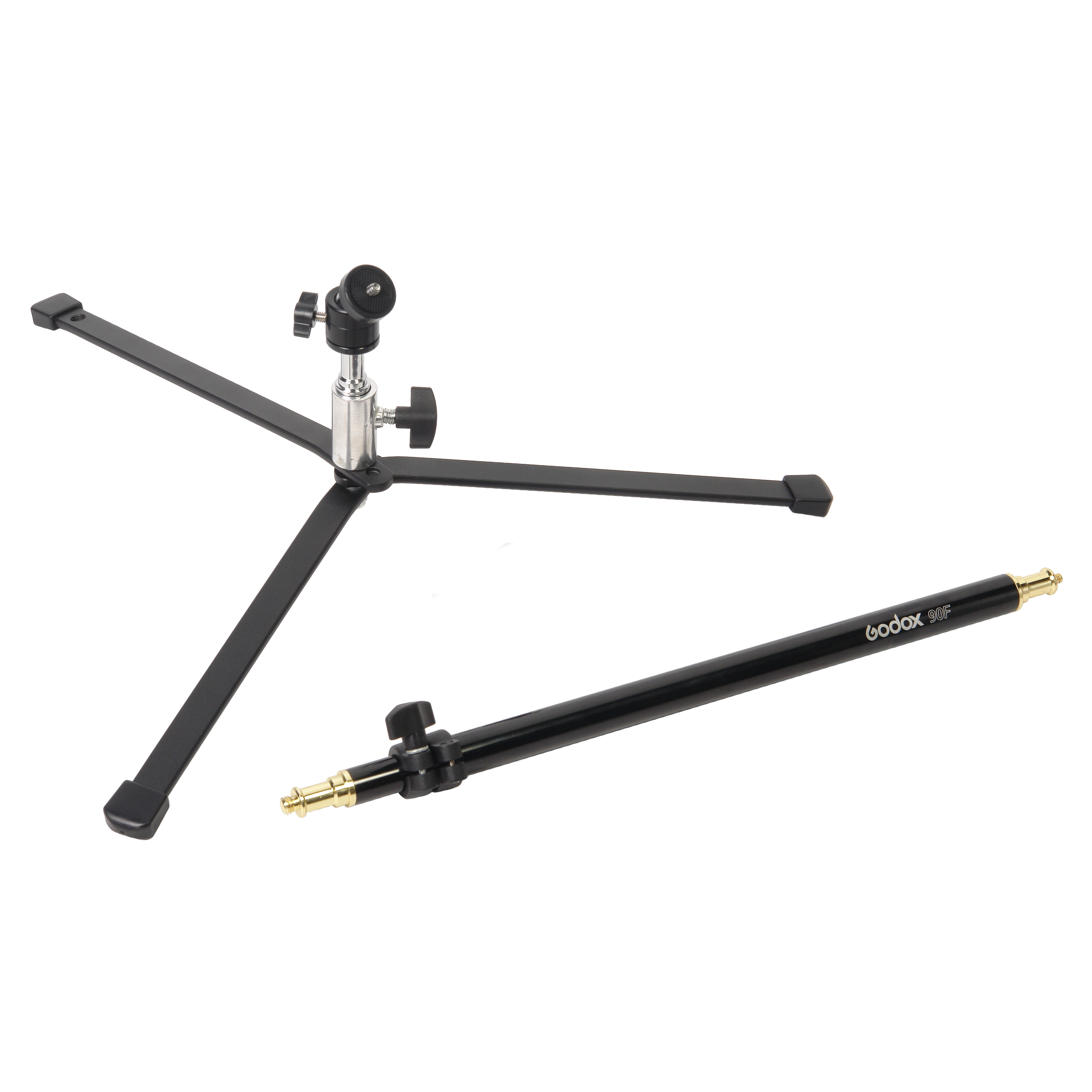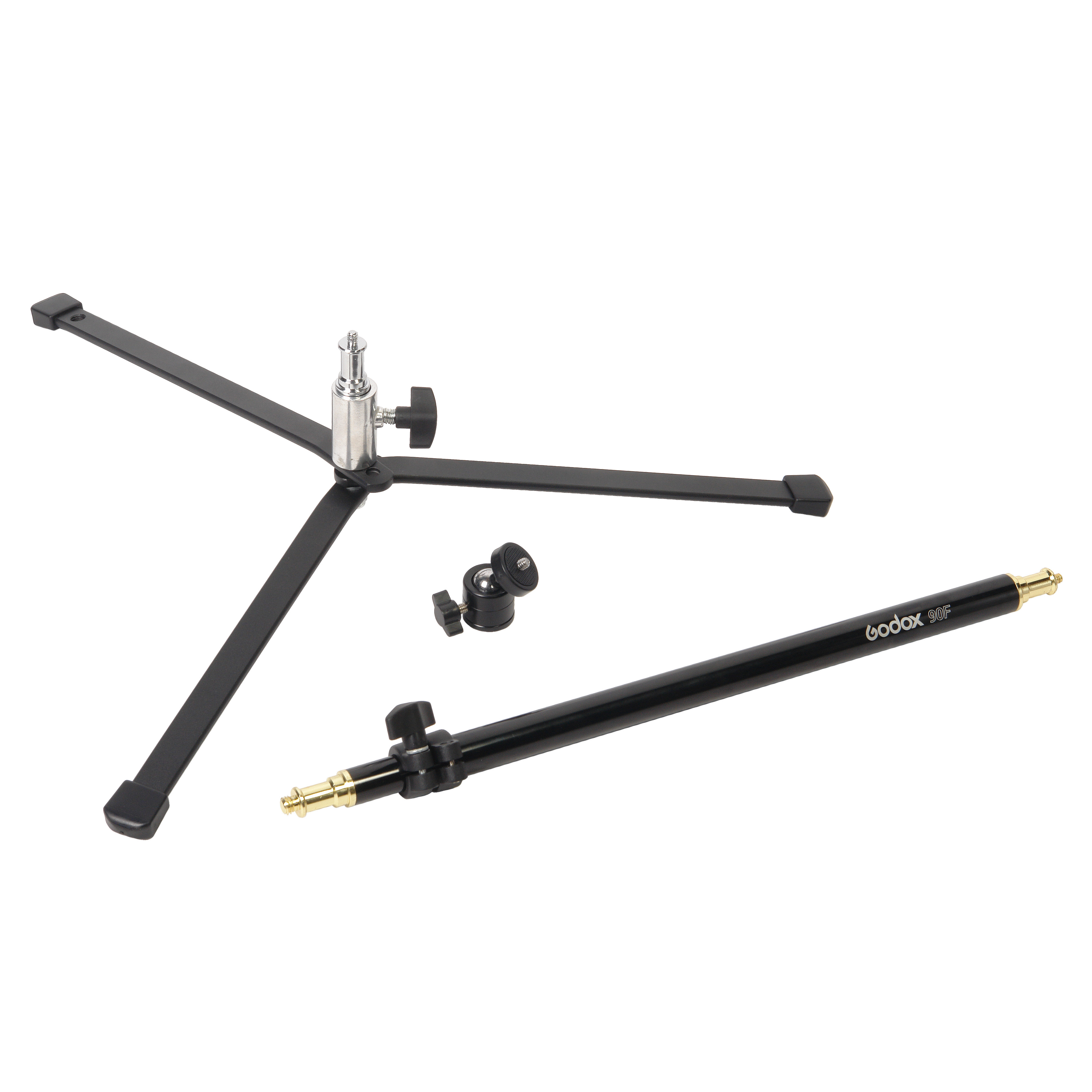 Стойка Godox 90F снабжена шаровой миниголовкой с металлическим винтом на конце с посадочной резьбой 1/4”, на который устанавливаются, например, цифровые камеры. Установленное оборудование может вращаться вокруг своей оси на 360 и наклоняться вперед в пределах 90°. В комплект также входит гайка-переходник с резьбы 1/4” на 3/8”.