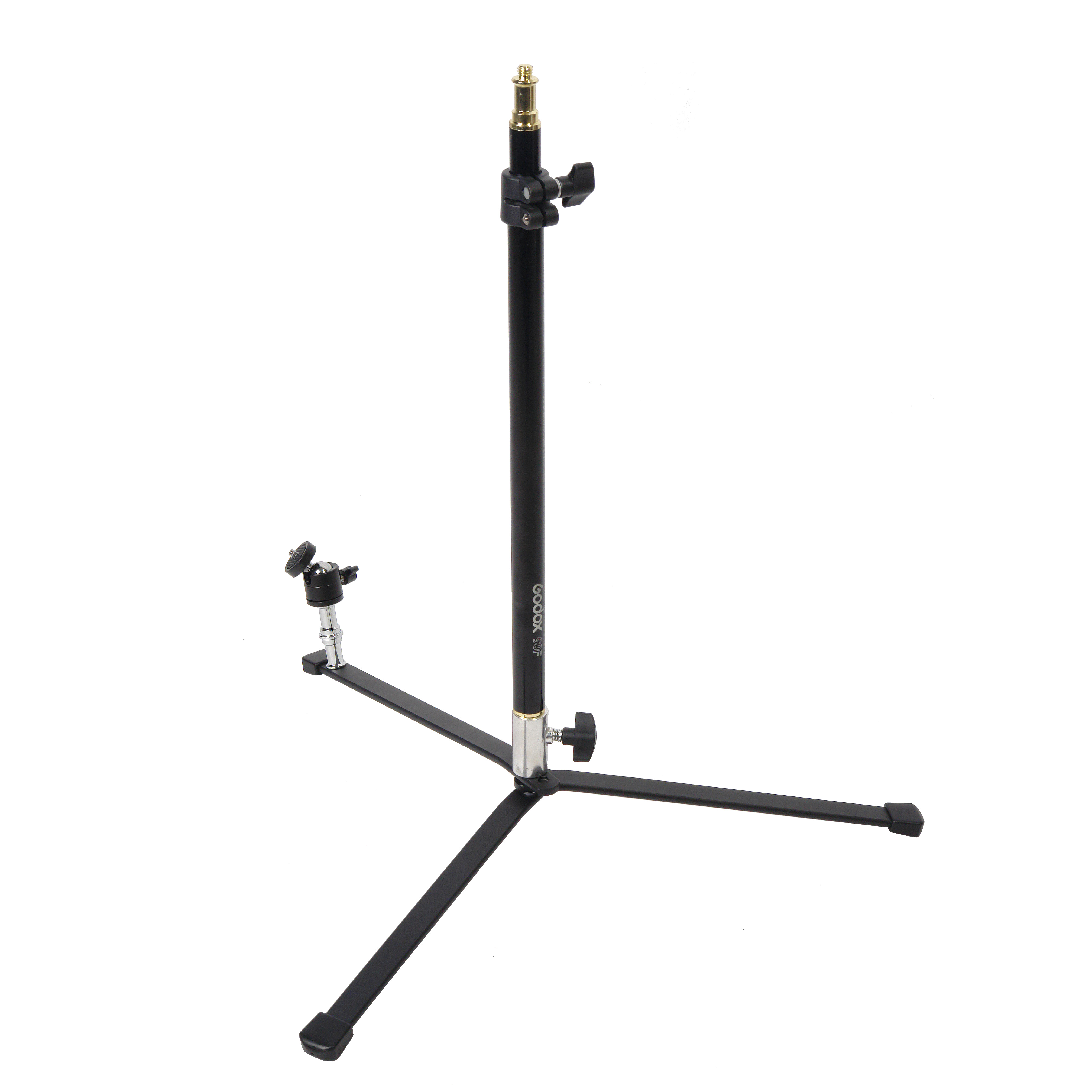Godox 90F - компактная алюминиевая стойка-тренога с 2-секционной съемной телескопической центральной колонной, на конце которой закреплен несъемный латунный шпигот диаметром 5/8” с резьбой 1/4” и головкой для установки цифровых камер. Стойка предназначена для съемки с нижней точки в фото- или видеостудии, а также на выезде. Длина стойки в сложенном виде - 48.5 см, максимальная высота 88 см, вес 1.3 кг. Стойка выдерживает осевую (вертикальную) нагрузку до 3 кг.