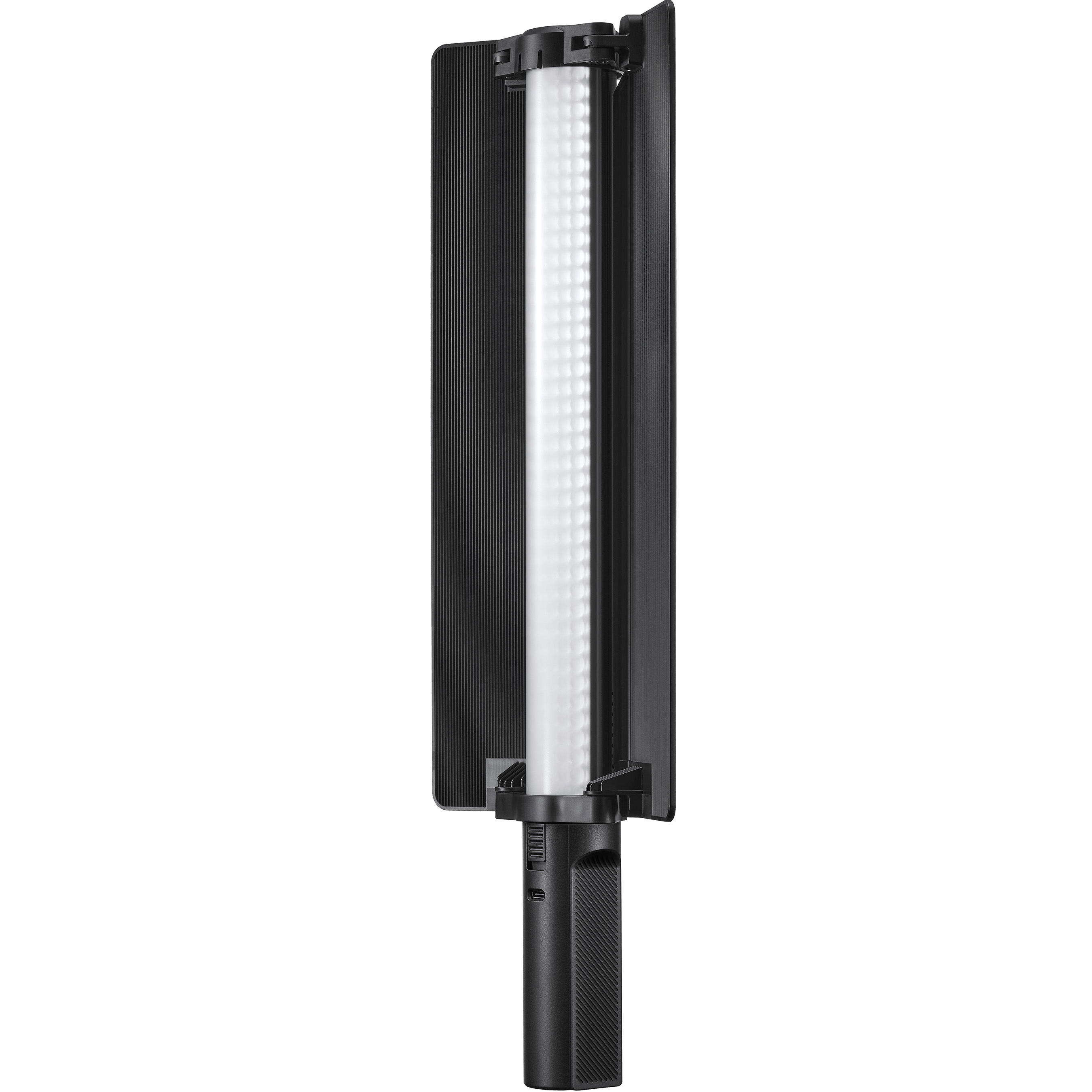 Осветитель оснащен инновационной сменной рукояткой с аккумулятором, позволяющей легко увеличить запас энергии для бесперебойной работы во время съемки на открытом воздухе. Рукоятка разработана с учетом требований эргономики и имеет нескользящее покрытие, что обеспечивает удобство и точность работы.